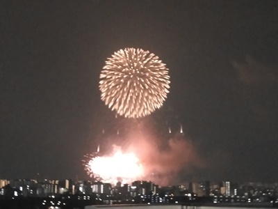 実家のベランダで戸田橋の花火観覧。